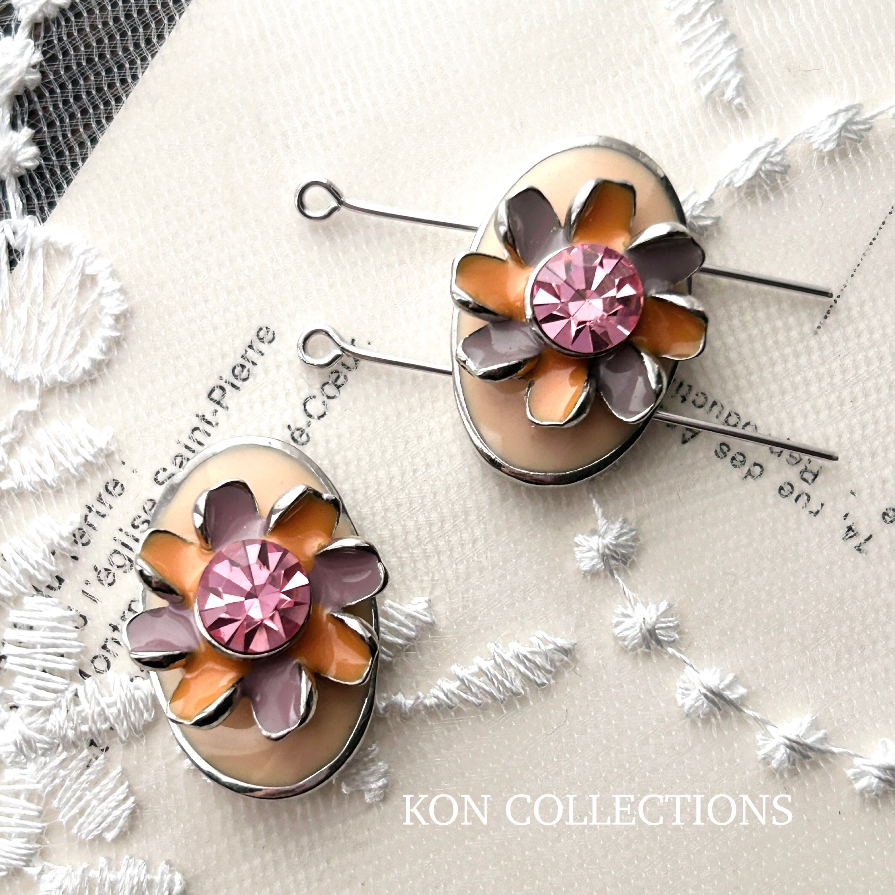 現代メタル2ホールビーズ1個/立体ラベンダーとオレンジのお花×オーバル×シルバー