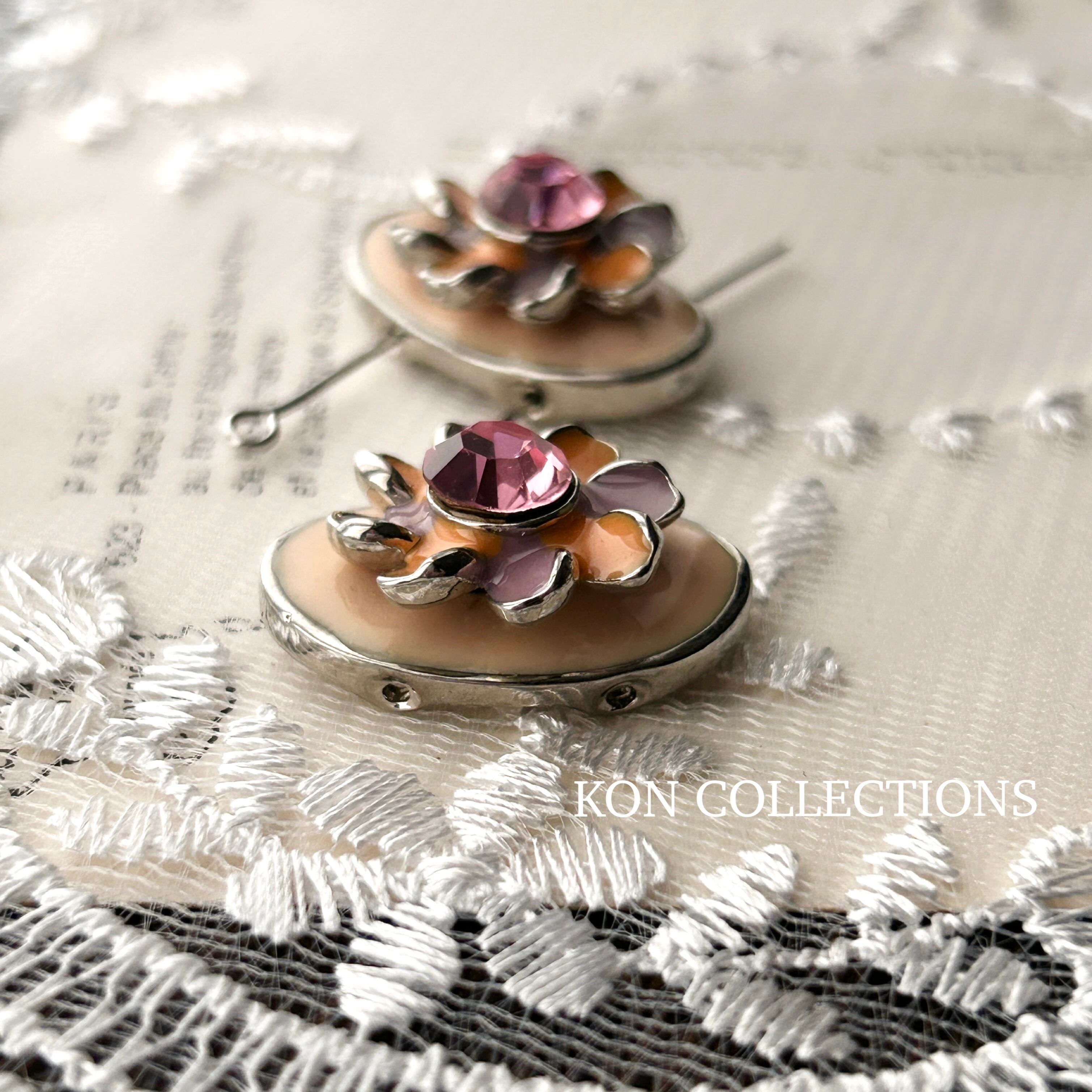 ゴムテグスに通してブレスレットにお使いいただける2ホールタイプのビーズですが、カボションとしてもお使いいただけそうです。ピーチオレンジのエナメル塗装に立体的なお花がついています。お花の中心は7mmサイズのスワロフスキーストーン。花びら部分の色の順番が個々に異なりますが、どちらになるかはおまかせください。