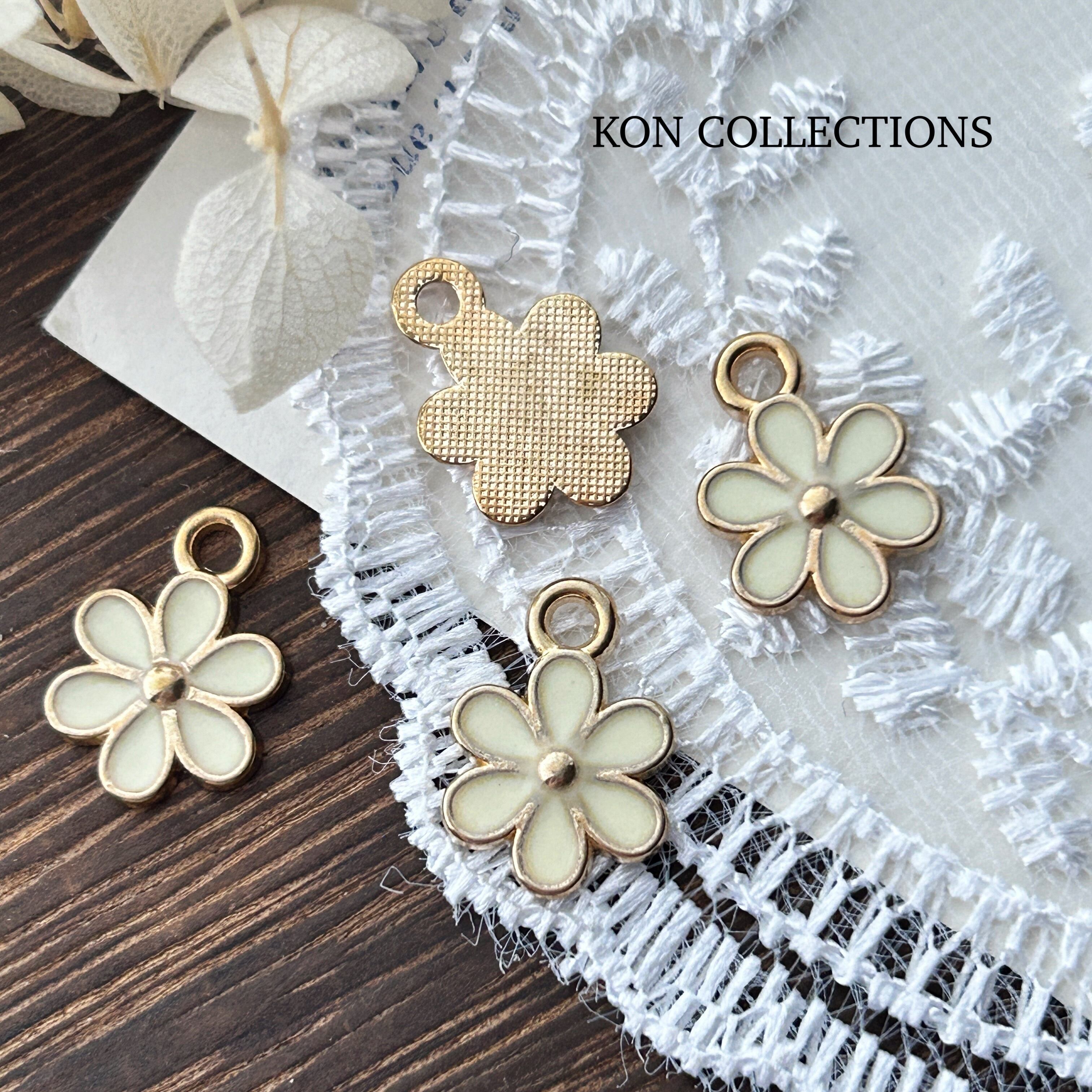 現代メタルチャーム4個/アイボリー色6弁のお花×ゴールド