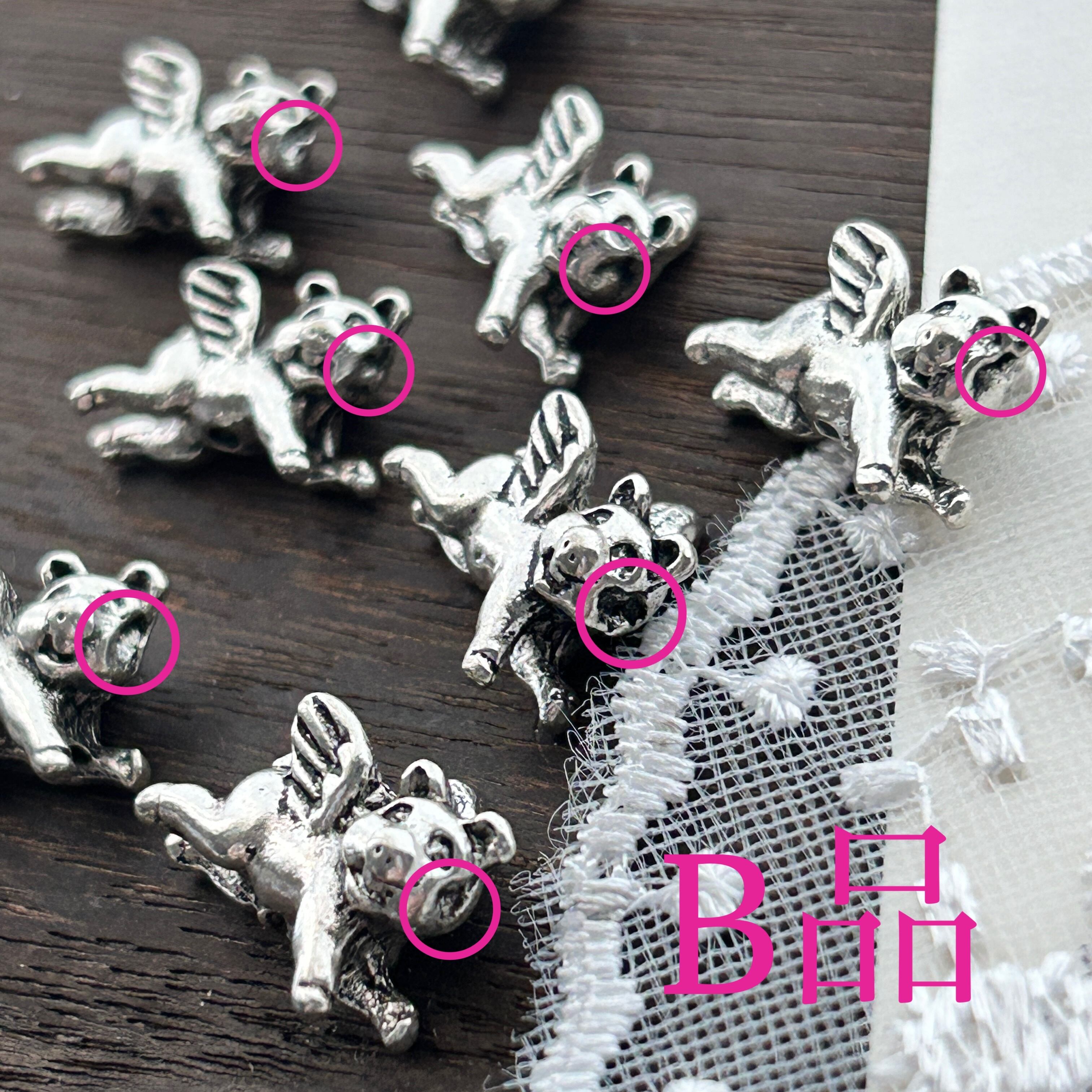 羽のついた豚の天使の立体的ビーズ。2枚目画像のように、向かって右側のほっぺた部分が横からみると凹みがあり、成形不全のため販売からはじいたB品になります(本来は定価1個90円で販売していた商品です)。くぼんだ部分にストーンをつける等リメイクしたり練習用にいかがでしょうか。凹み方は個々に異なります。8個セットが複数ございますので画像の物が入るとは限りません。
