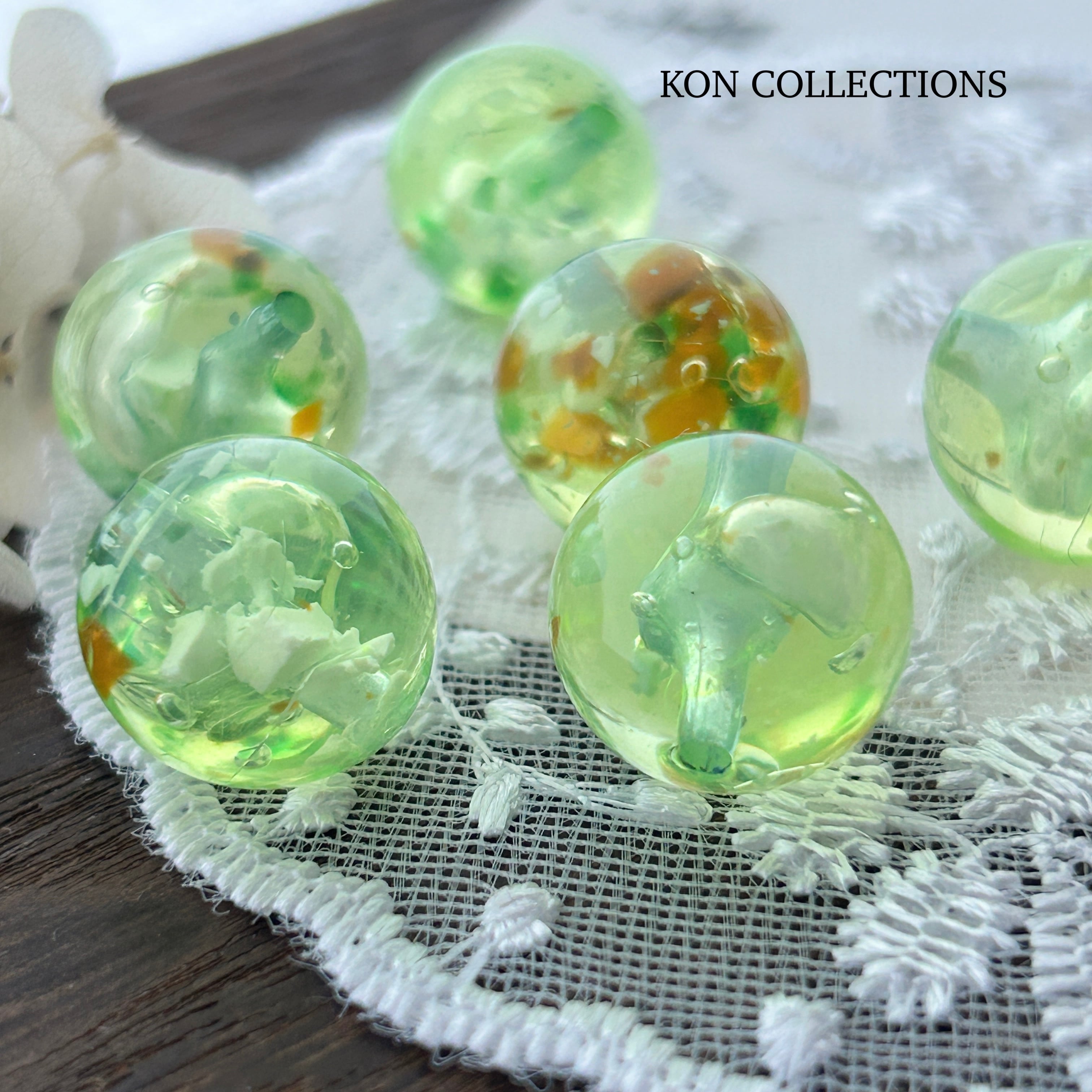 透明なライトグリーンビーズの中に白の何かと茶色やグリーン色や気泡が入っている不思議なビーズ。茶色がほとんど入っていない物もあり、個体差が大きいので画像の6個まとめての販売になります(通常販売価格は1ペア280円ですが少しお安くなっています)。封入の過程でできたと思われるヘアライン状の筋などが表面にありますが不良品扱いにはなりません。カスタムボールペンには通りません。