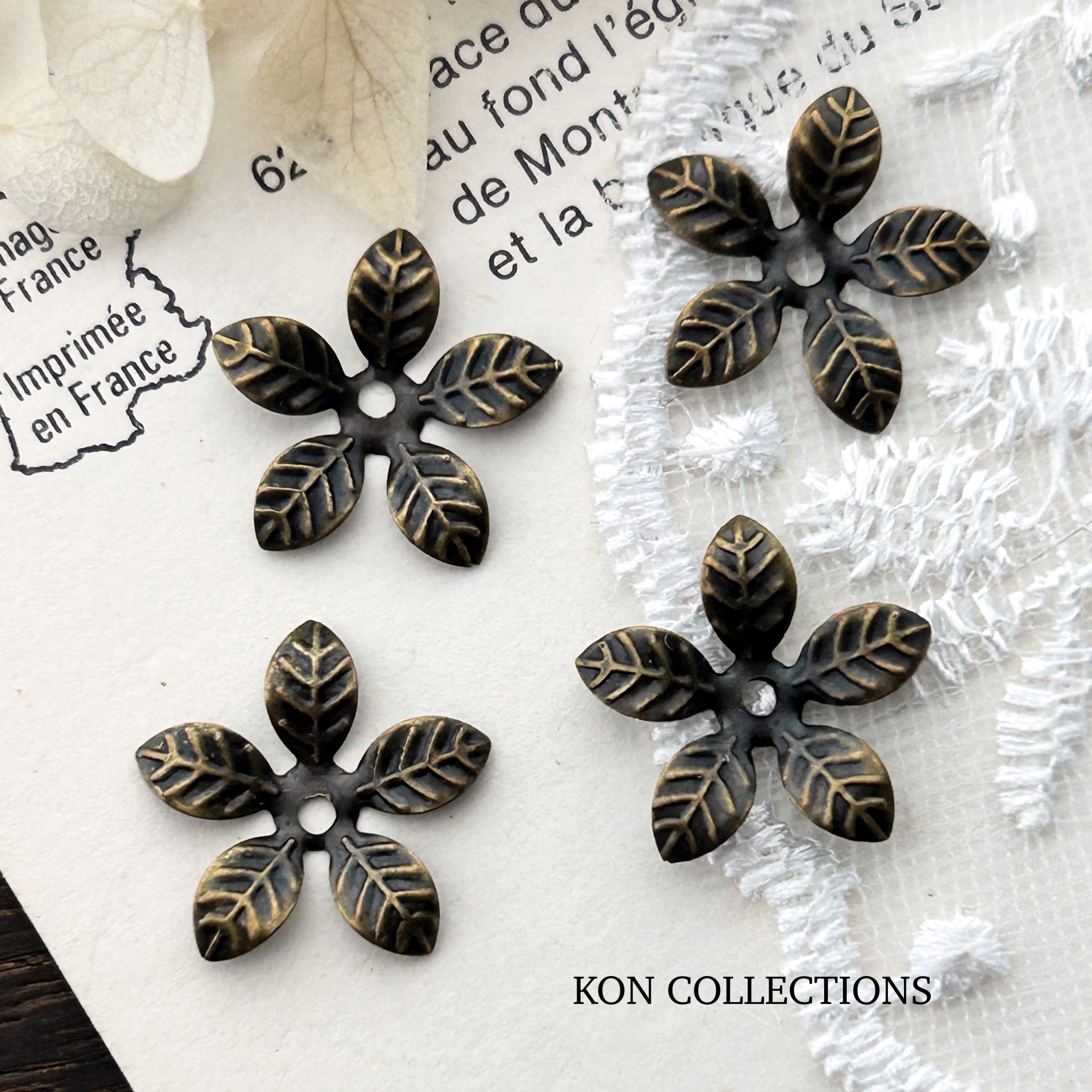 現代物メタルビーズ4個/葉っぱのお花×金古美