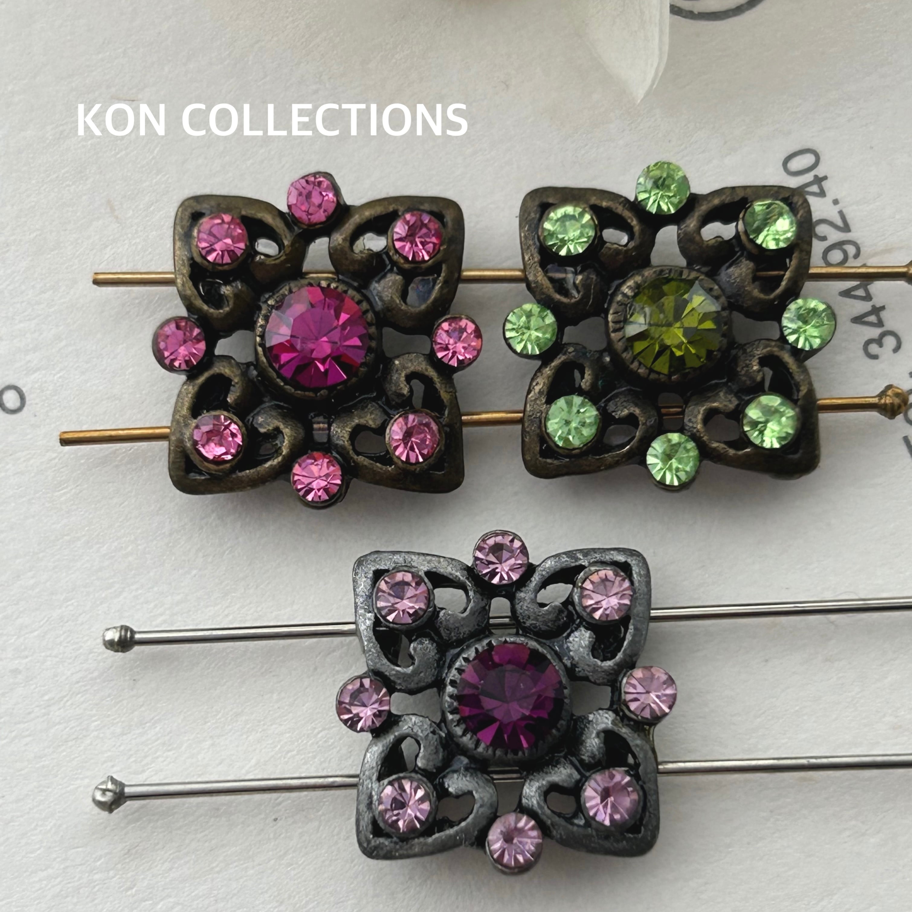 スワロフスキーラインストーンがキラキラします♪2ホールタイプですが、裏面の足をカットしてレジンなどで処理をしてカボションにしてもよさそうです。①と③のメタル部分は金古美で、➁は銀古美になります。