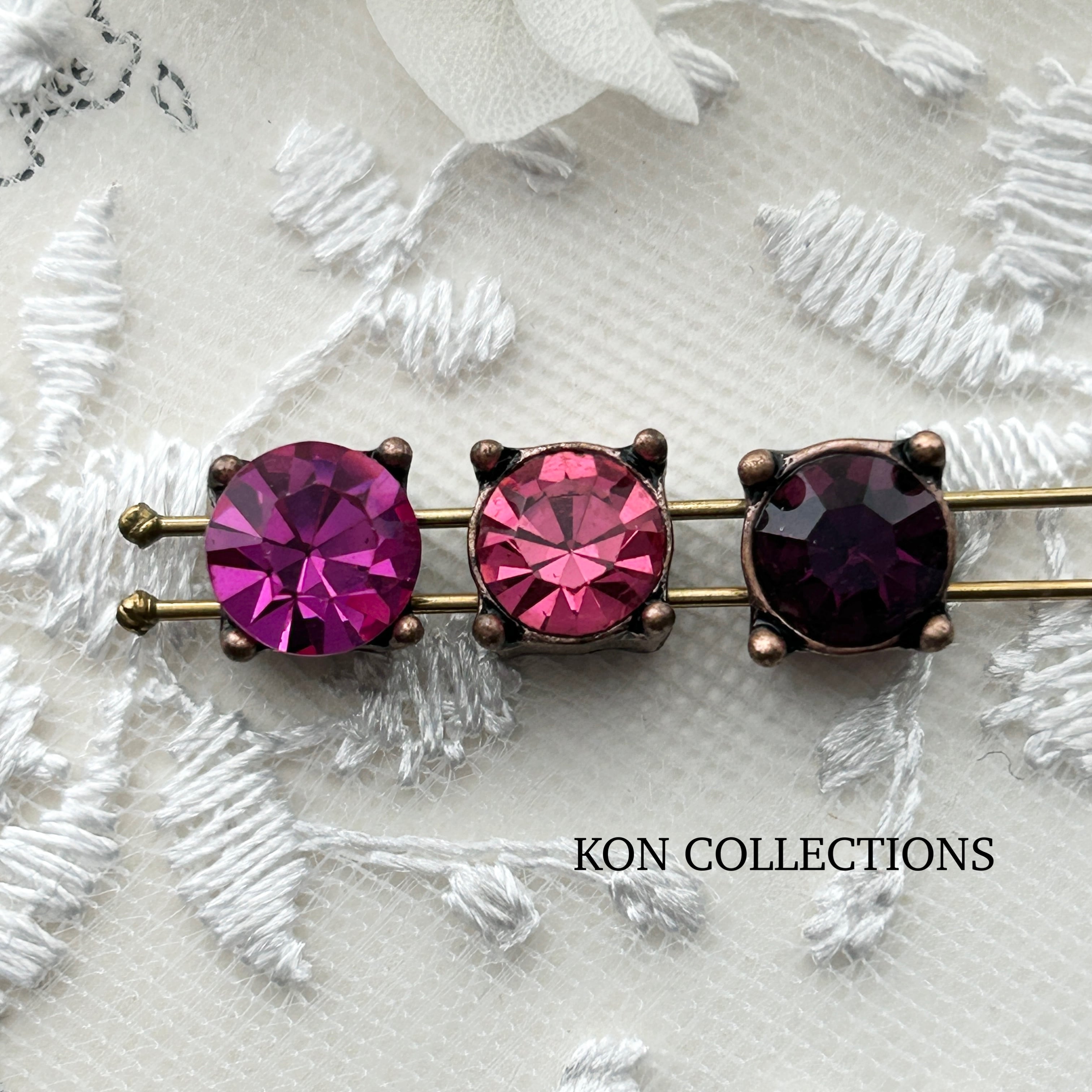 スワロフスキーラインストーンがキラキラします♪2ホールタイプなので編み込みしてアクセントにお使いください。①のフューシャだけ少しスートンが大きいです。金具部分が銅古美色は珍しくておすすめです♪