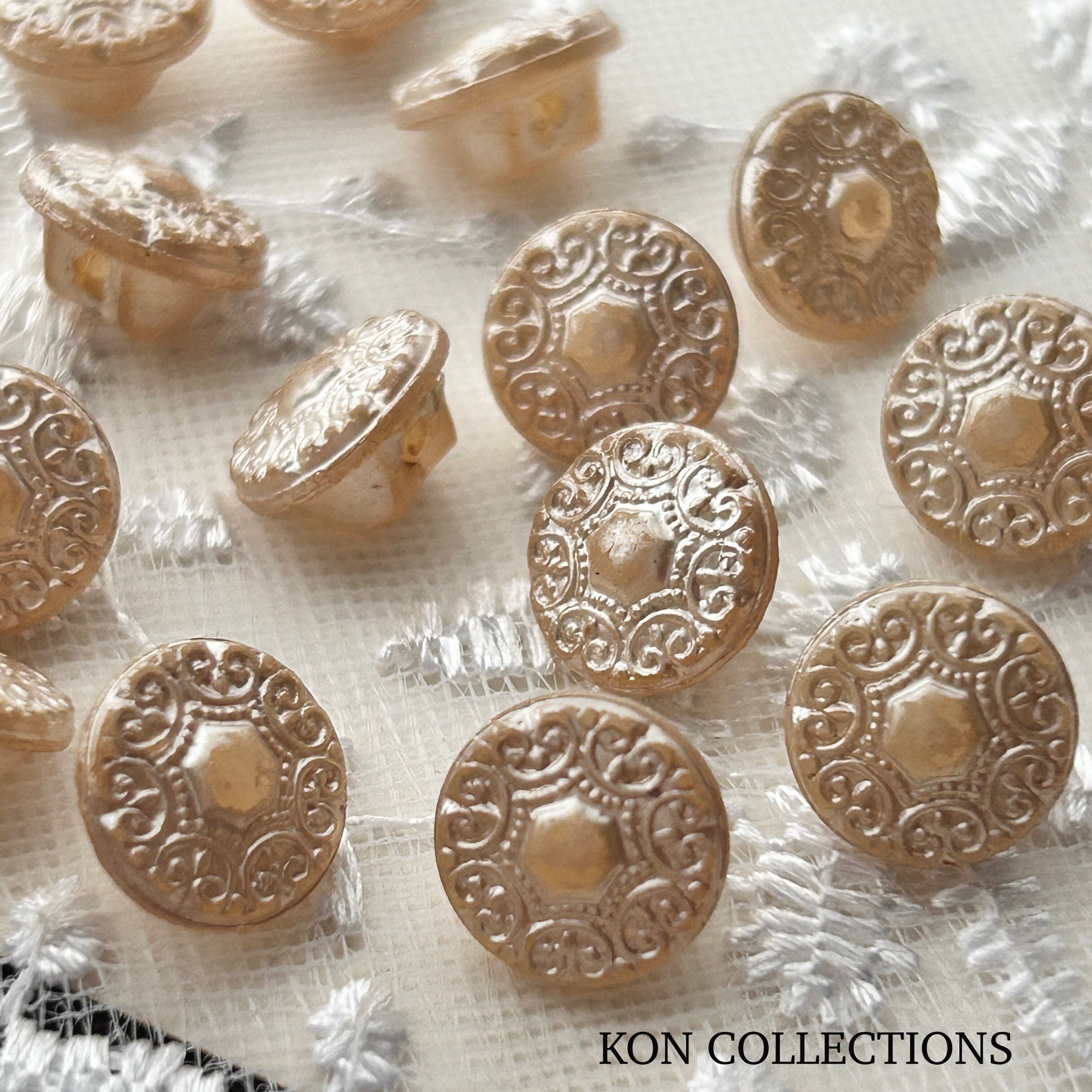 小さめですがベージュの色合いとデザインが素敵なボタン。ガラスベースにパールコートですが、よく見ると真ん中部分のコートにハゲがありますのでご了承ください。タイガーブランドのジャパンヴィンテージ。