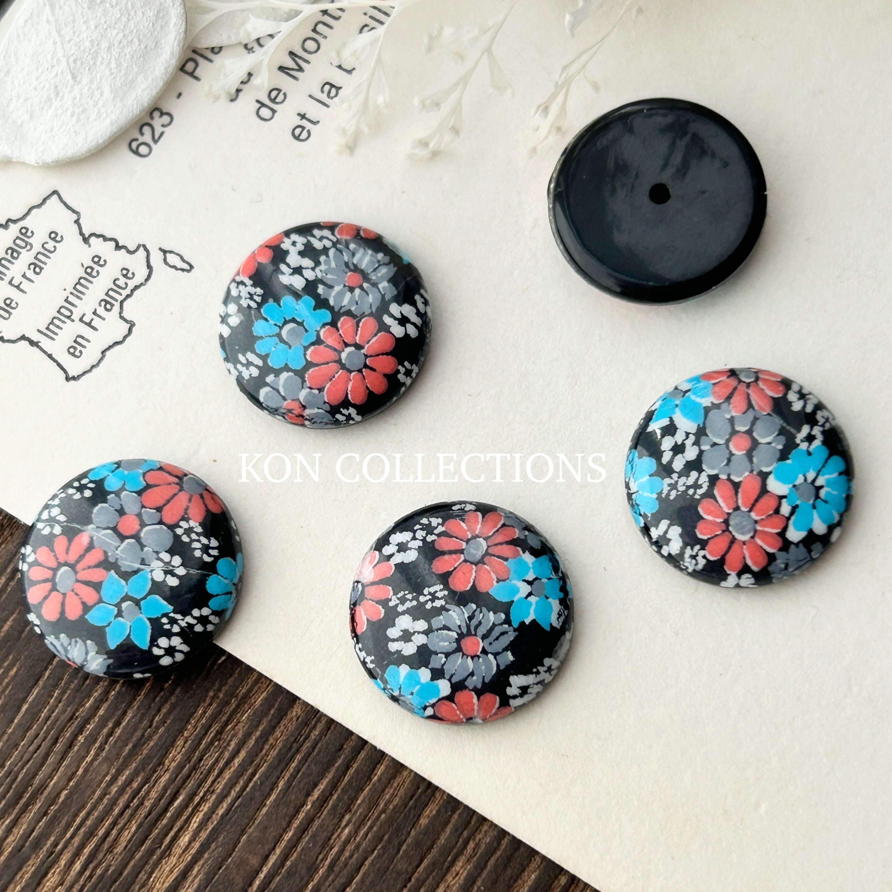 ヴィンテージカボション2個/ラウンド15mm/花模様×ブラック