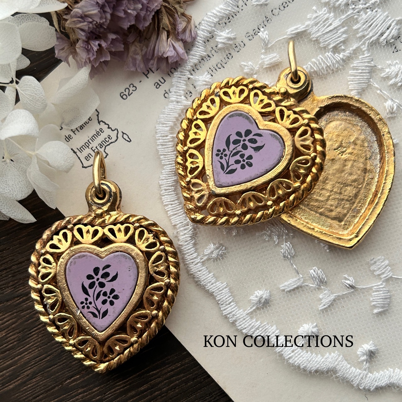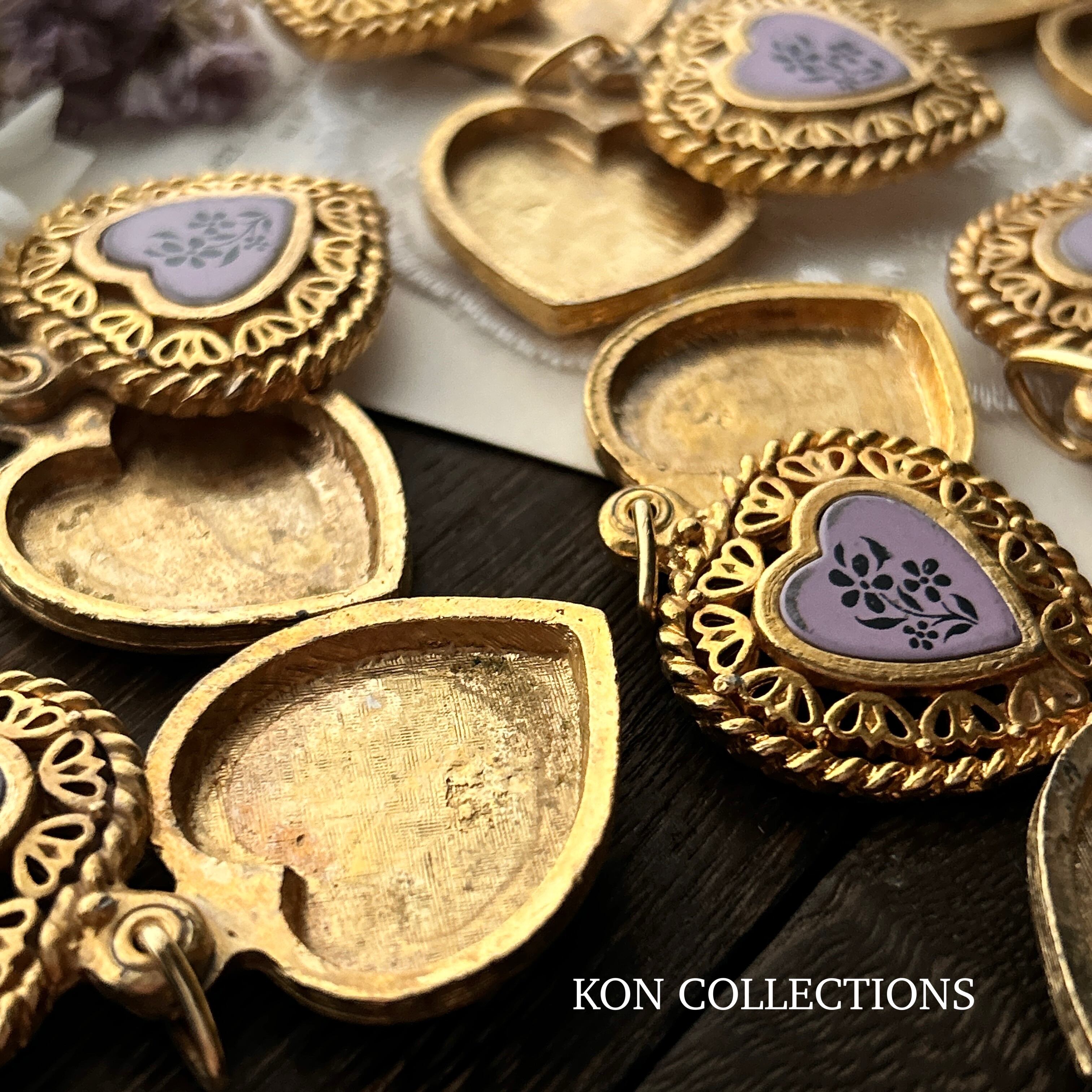 ずっしりと重量感のある大きめハート形ペンダントロケット。真ん中にお花模様のパープルピンクのカボッションがついています。全体的に経年による変色や汚れ、メッキの剥がれや傷がありますが、ヴィンテージならではの味わいとしてご理解ください。