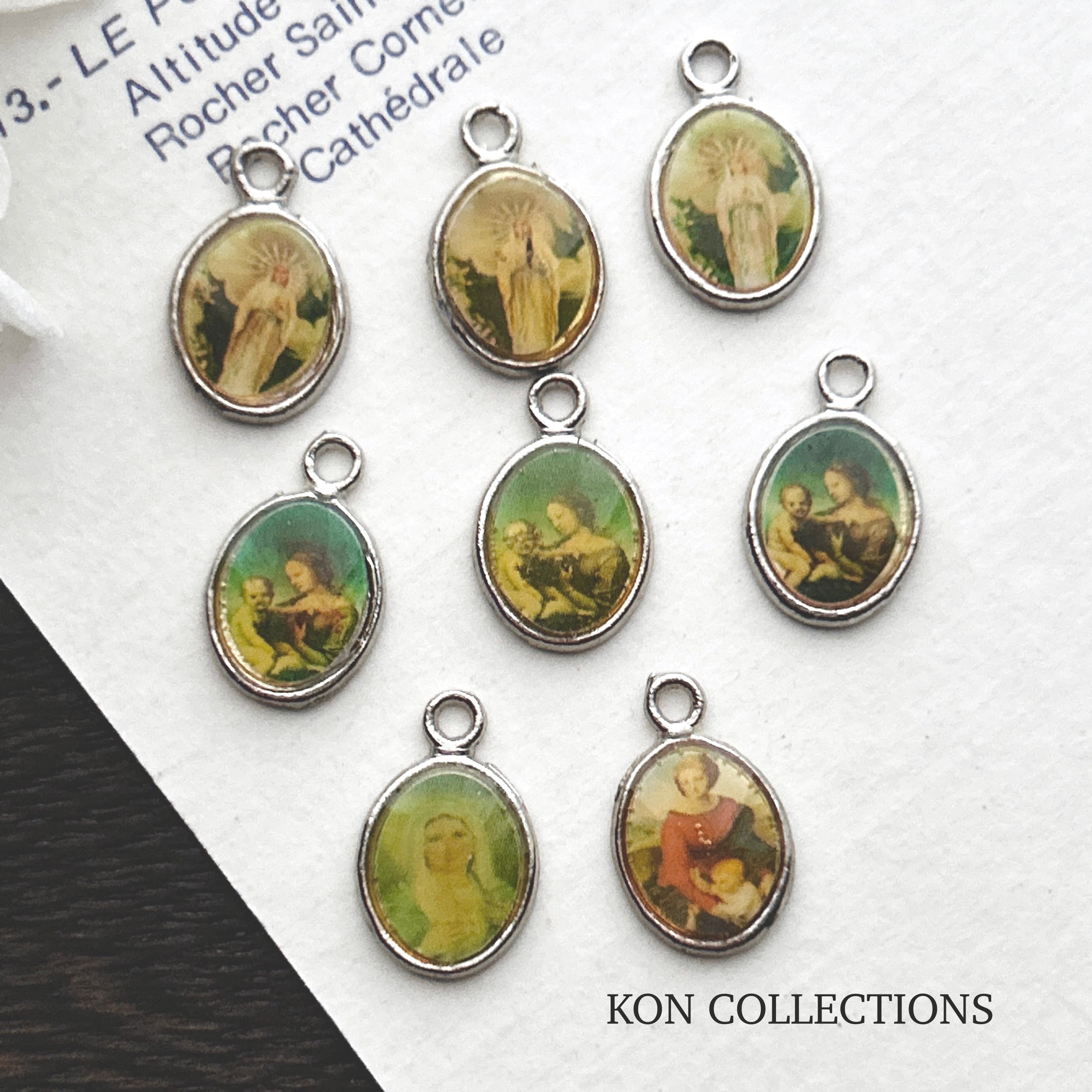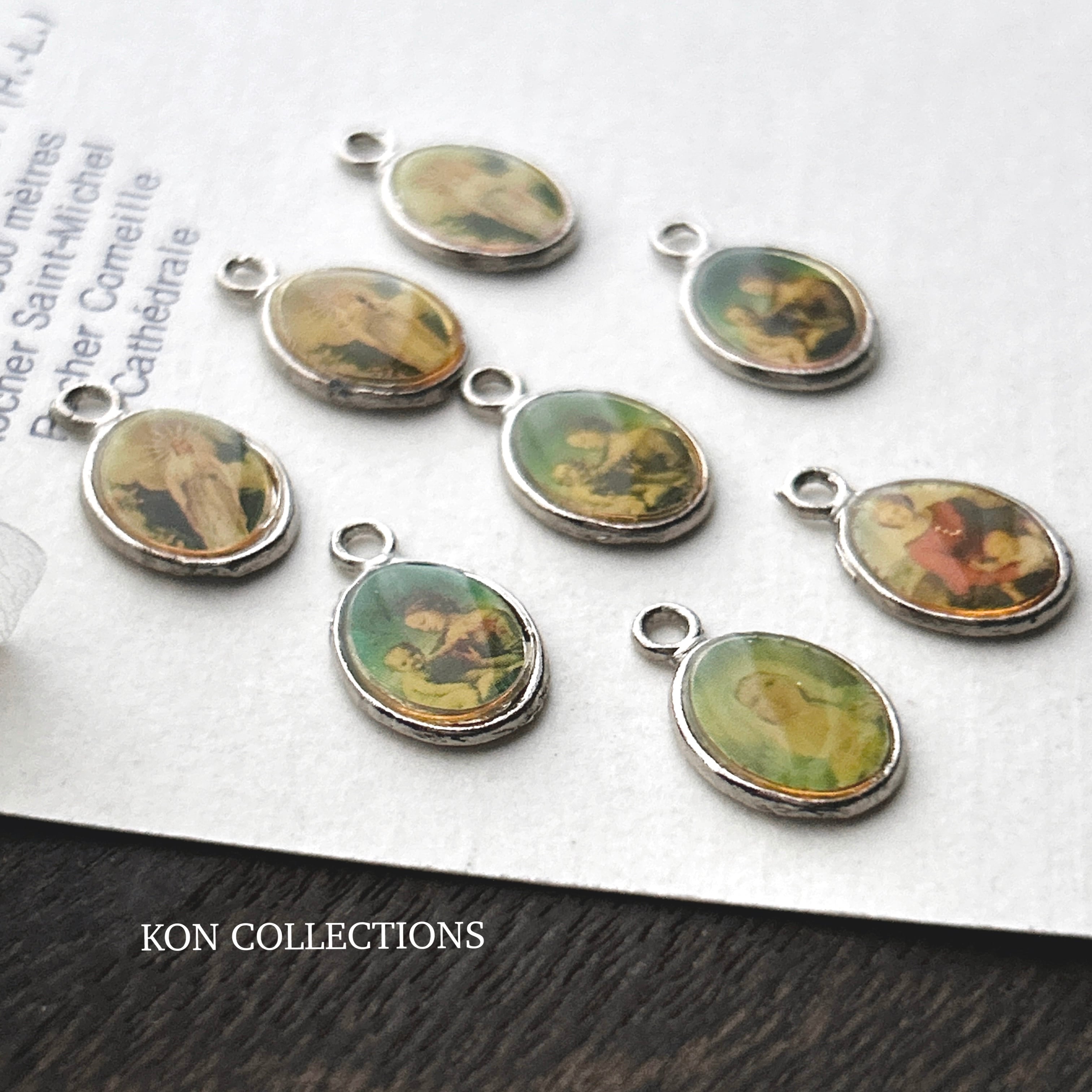 現代物ですがアンティークな雰囲気のキリスト教の絵柄で、裏面は十字架マークが浮き上がっています。同じ絵柄でも色の濃さに個体差がありますが、画像の8個まとめてのセットになります。