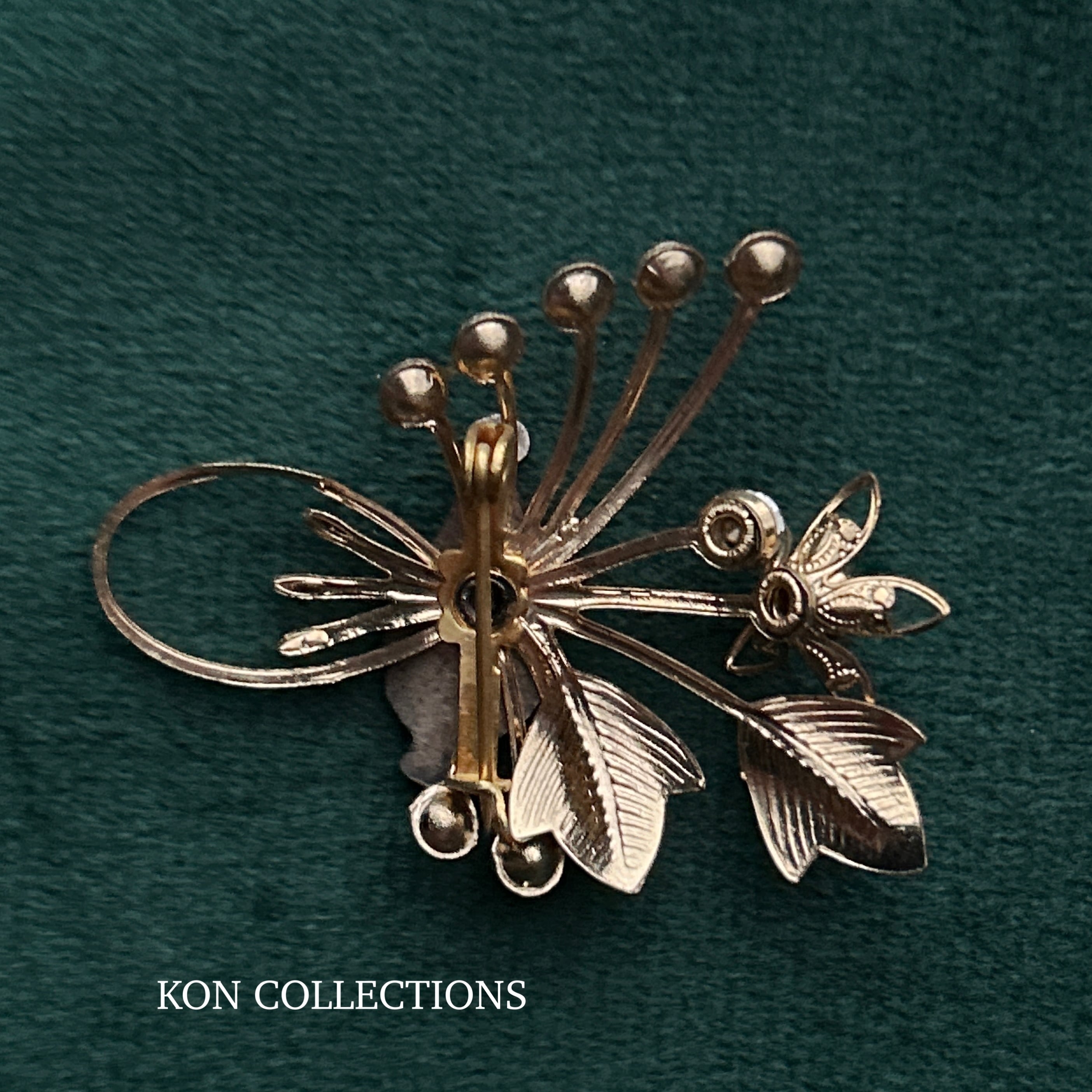 ピンブローチですが、画像3枚目の〇で囲った部分のピンをかける部分の向きがおかしいです。一応このままでも使用できますが、アウトレット品扱いにて。マリア像はマットシルバー色。ベースのフラワーモチーフなどの部分はライトゴールド色です。経年による変色が少しあります。ストーンがキラキラして綺麗です♪