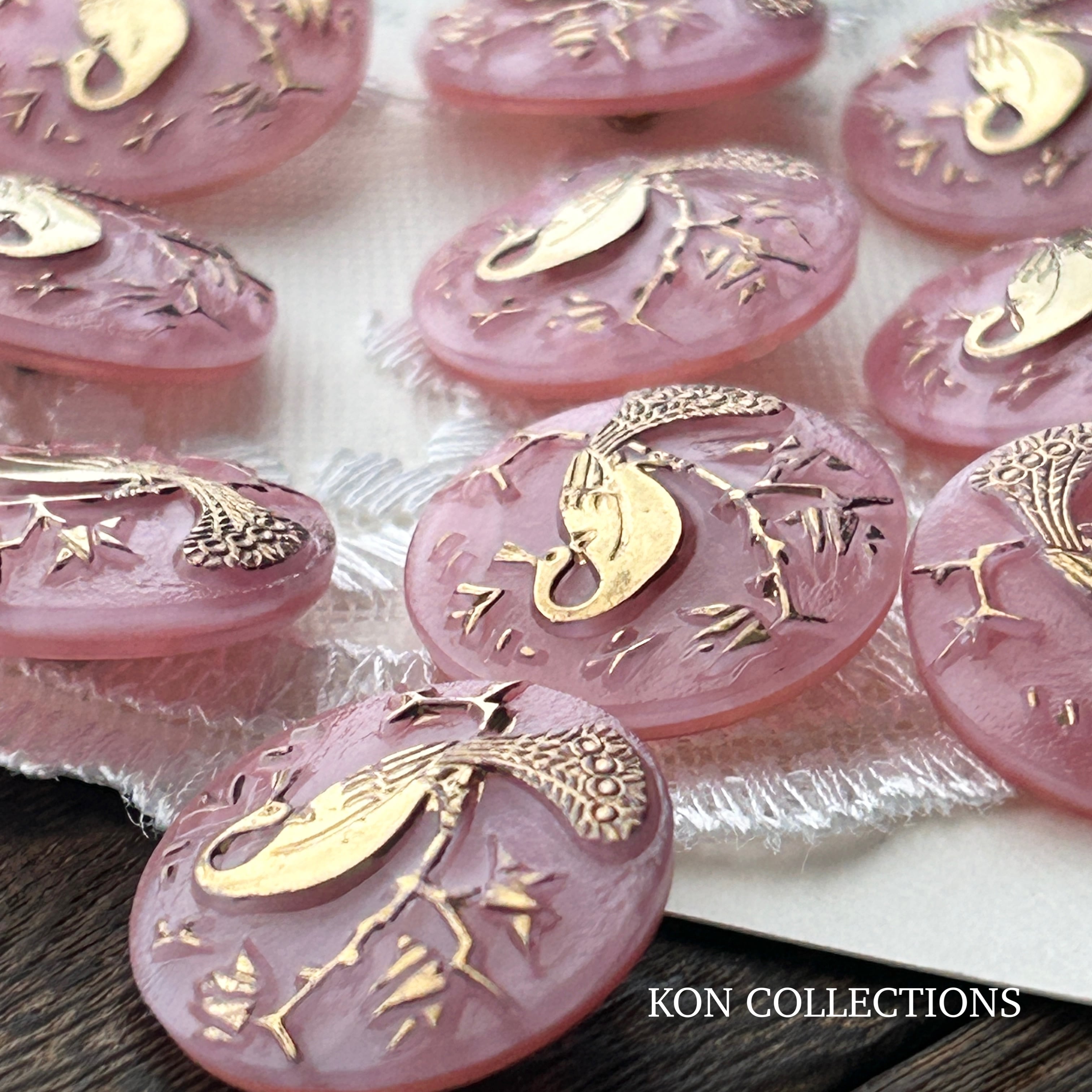 ヴィンテージチェコガラスボタン1個/孔雀×ピンク