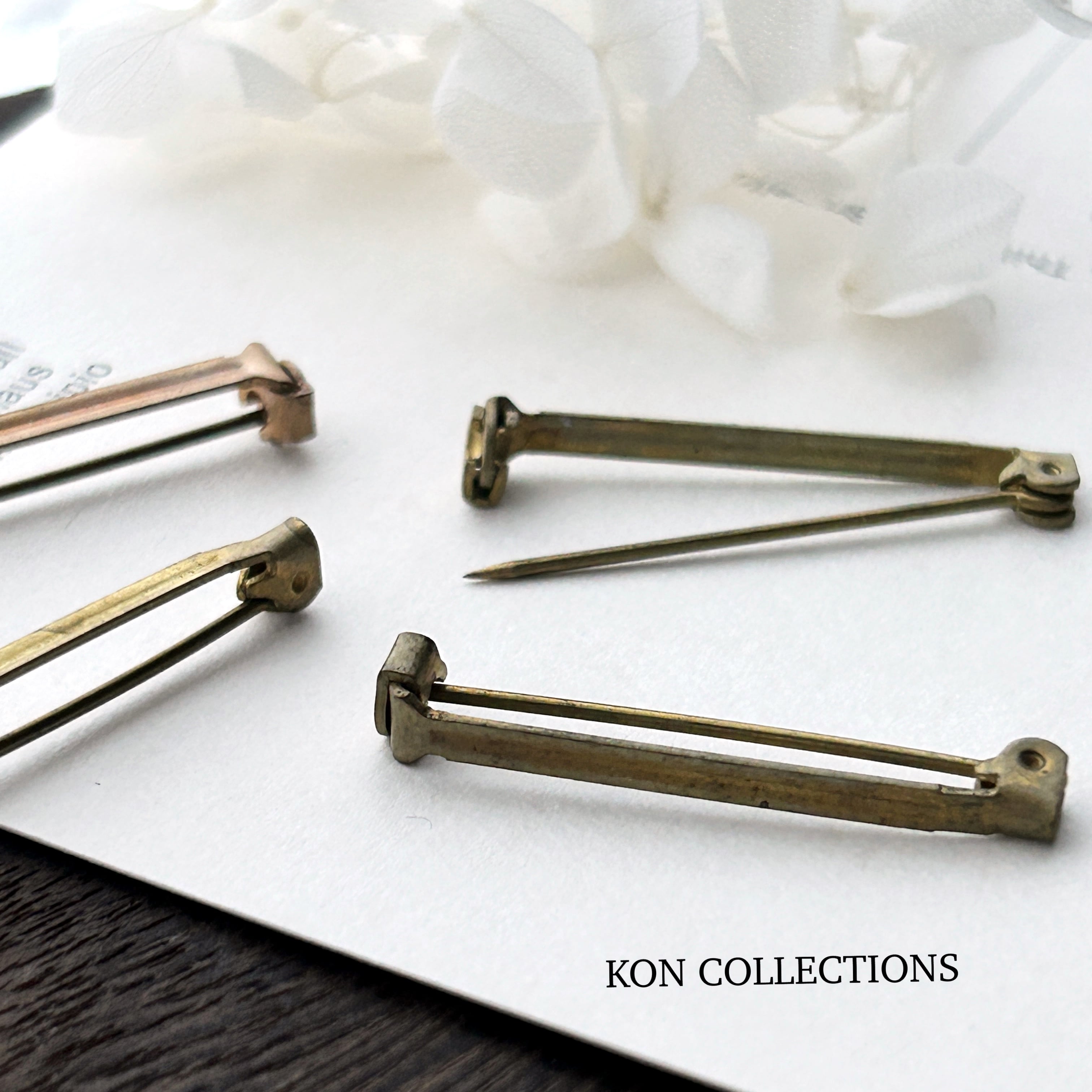 シンプルなピンブローチパーツ。カボションなどを貼り付けてお使いください。ヴィンテージ品のため、経年による変色や汚れがあります。マットな金古美色ですが、1枚目画像左上の1個のみバー部分の色合いが少し少し異なりますのでご了承ください。1セットのみで再入荷はありません。