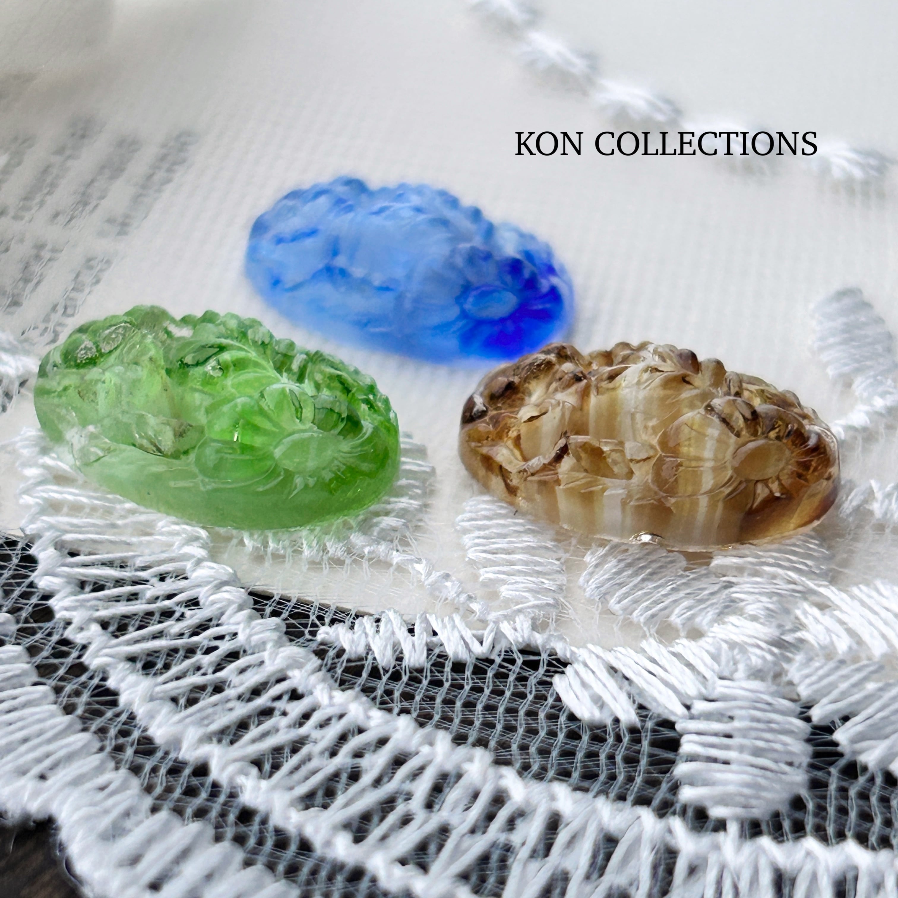 わかりにくいですが、お花と葉っぱの浮き彫りになっています。ところどころ穴があいているタイプですので、穴の部分にストーンをつけても♪それぞれクリアガラスに色と少しホワイトが入ったマーブルタイプ。レア商品。