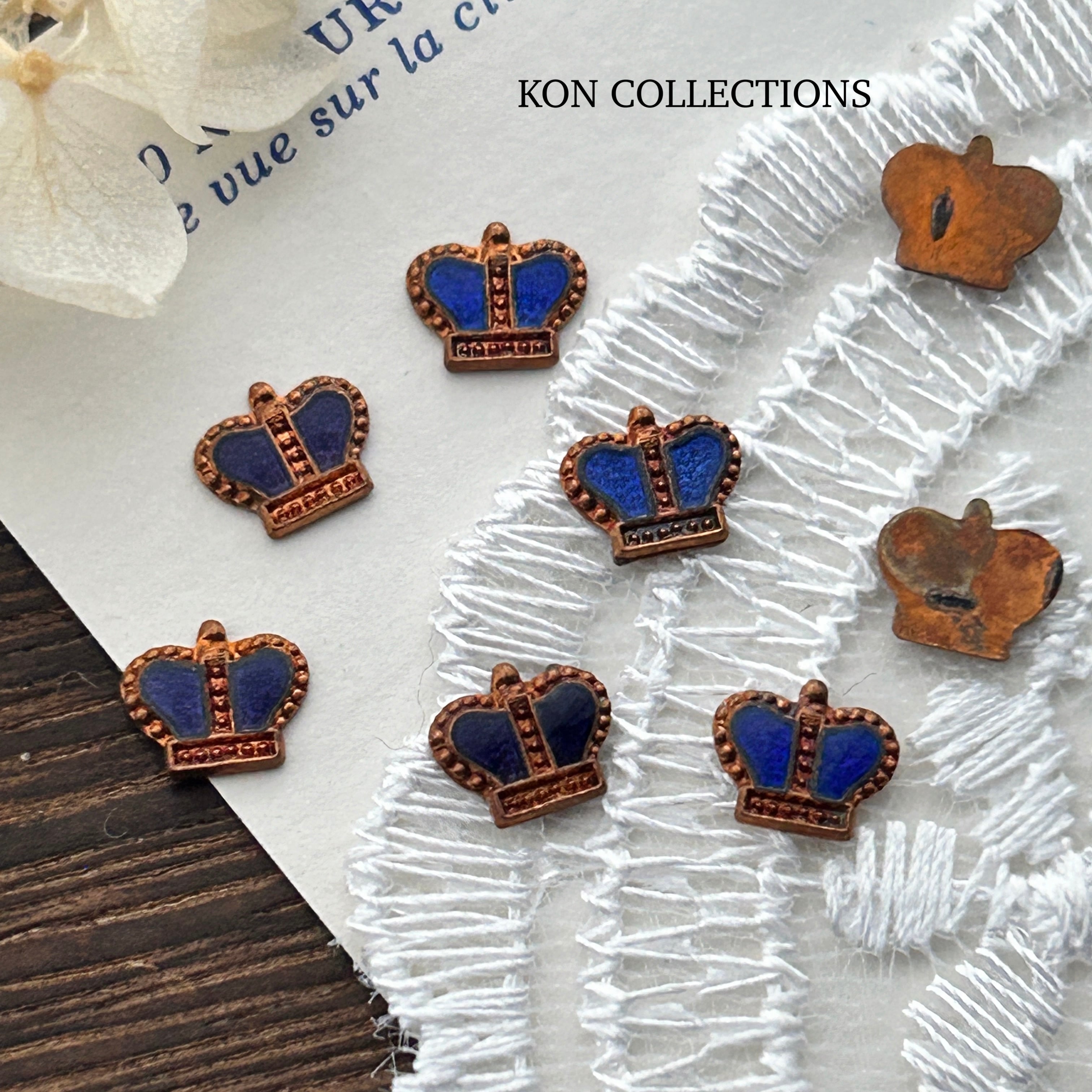 小さな小さな王冠のカボッション。ブルーのエナメルの色の濃さや付き方(少し盛り上がりがある物もあります)が個々に異なります。また、ベースのメタル部分は経年による変色があり、変色具合も個々に異なります。裏面はエナメルがついてしまったりしていて綺麗ではありませんのでご了承ください。