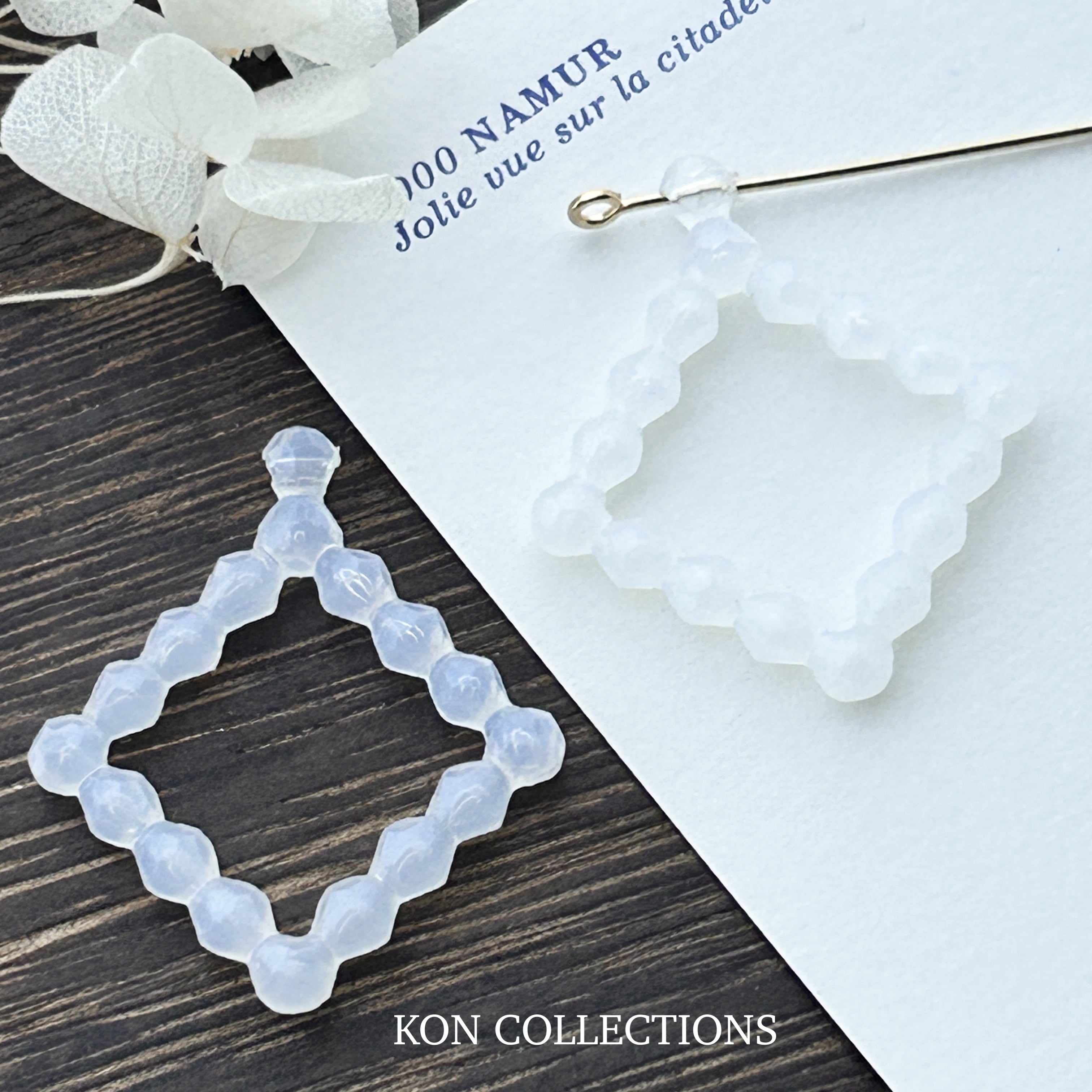 乳白色のひし形。一部マーブルのようになっている部分もあります。ターコイズグリーンより一回り大きいタイプ。両面同じデザイン。