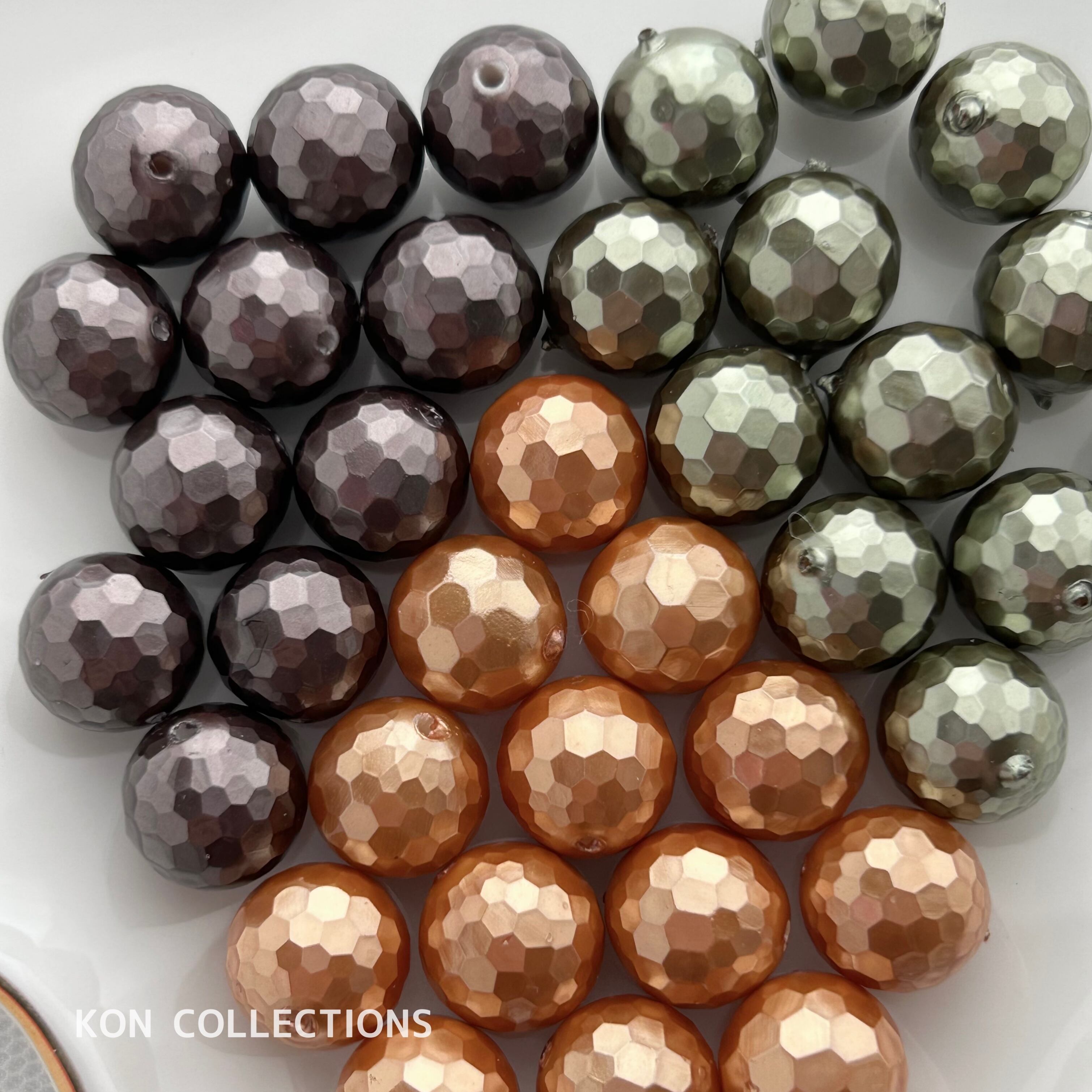 多角カットのシェルにパール塗装したビーズ。落ち着いた色合いが素敵です。ホールに塗装のバリが少しあります。