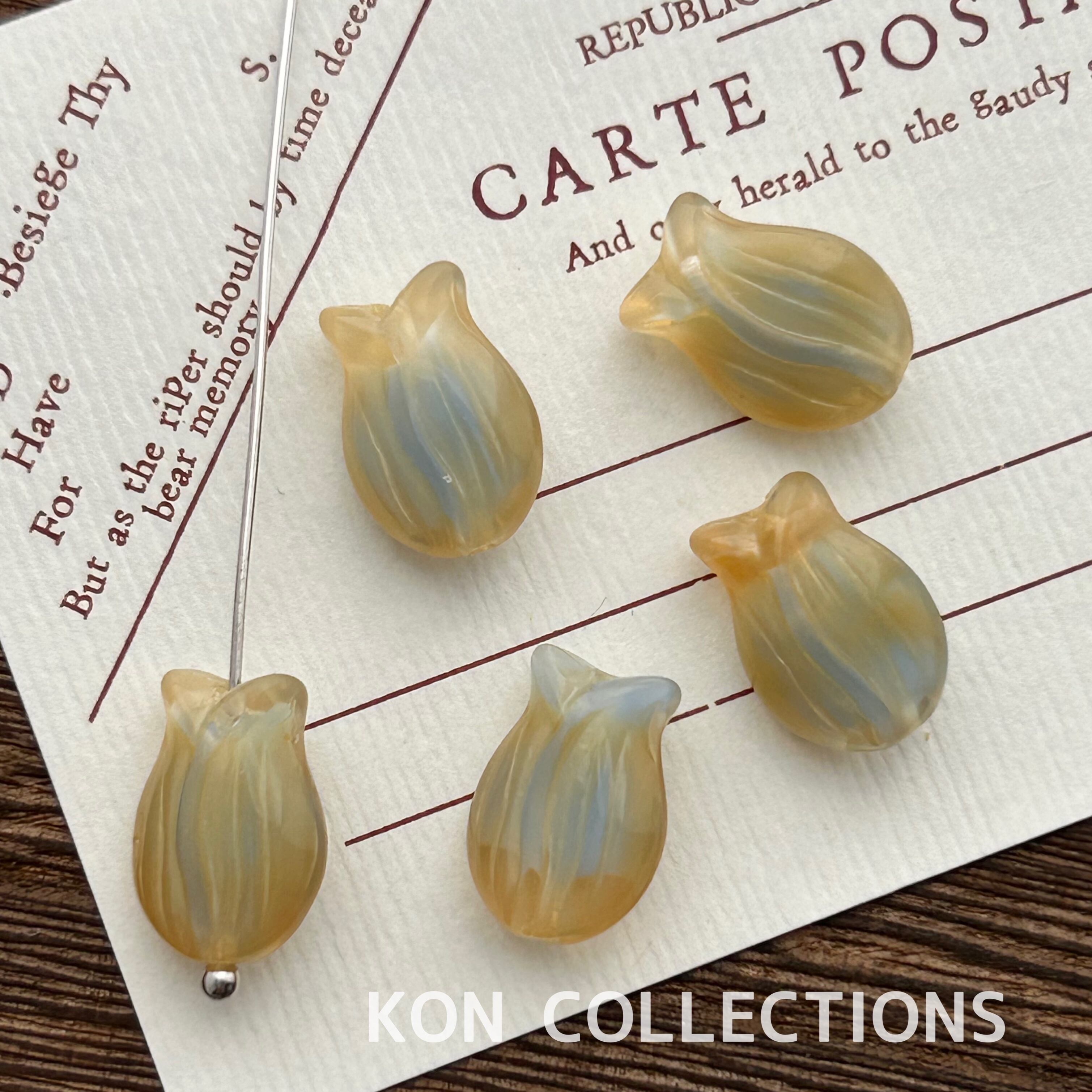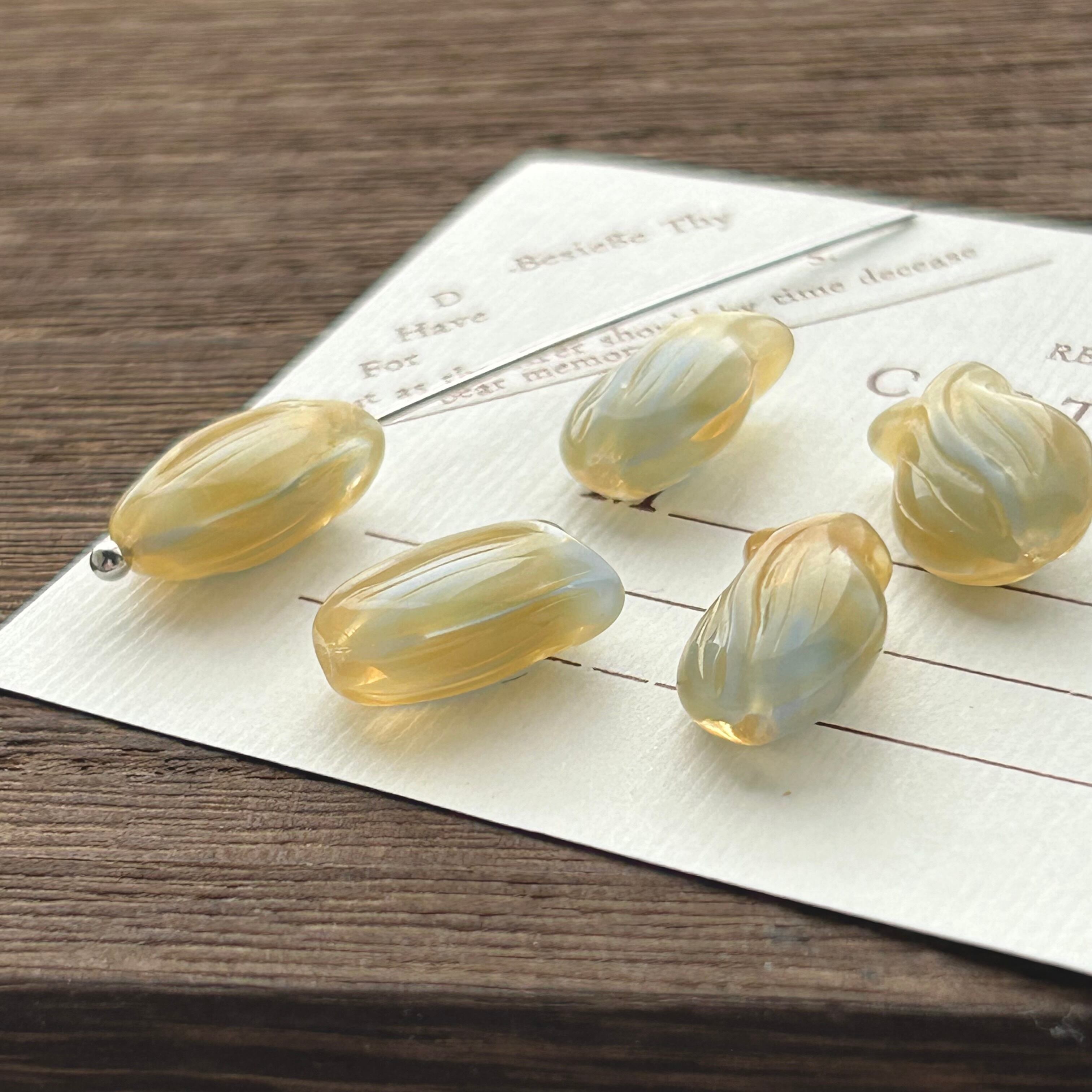 立体的なチューリップビーズ。くすんだシャンパンイエロー色にミルキーサファイヤブルーが入った素敵なビーズ。色の入り方は1個ずつ異なります。両面同じデザイン