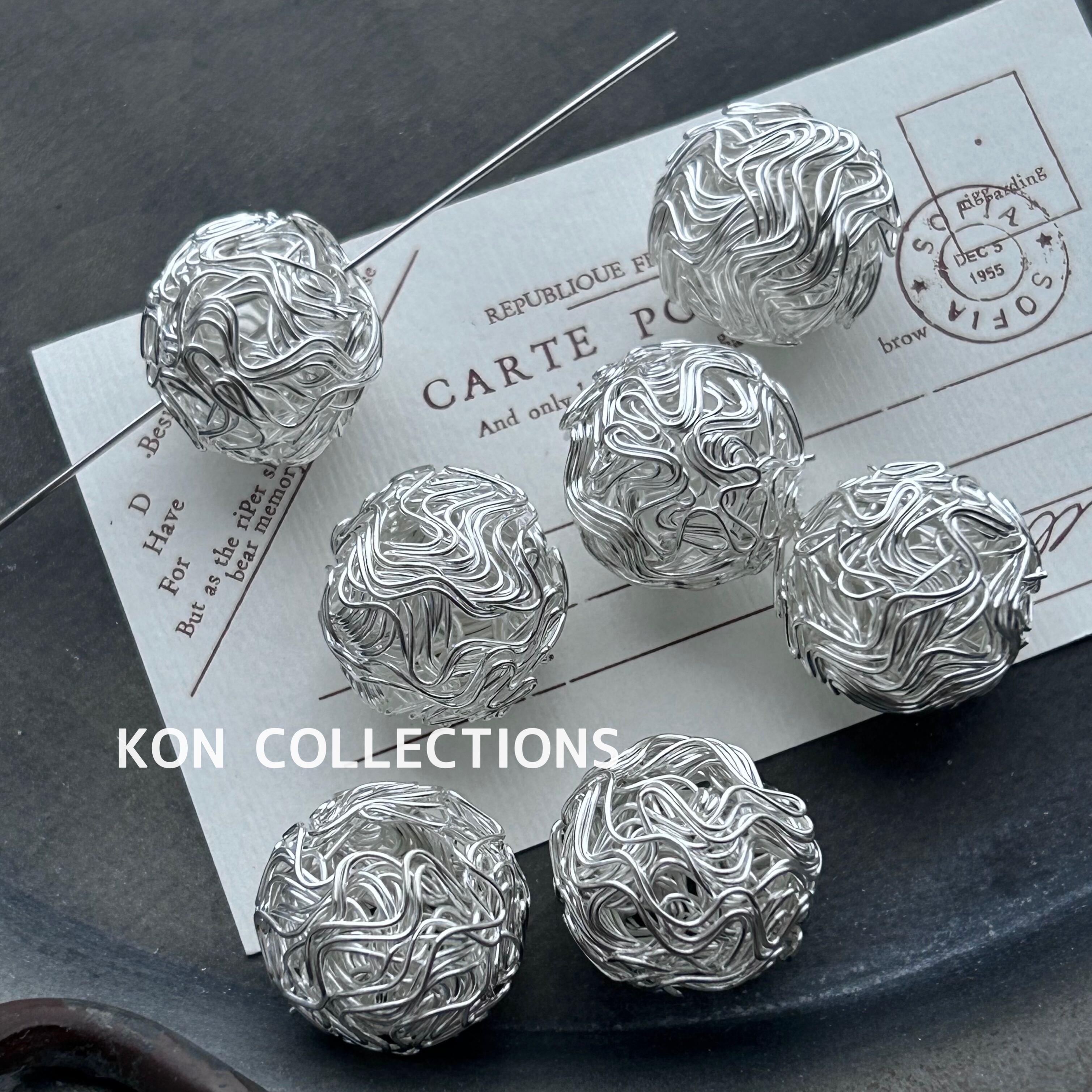 現代メタルビーズ2個/ぐるぐるワイヤーボール×ホワイトシルバー