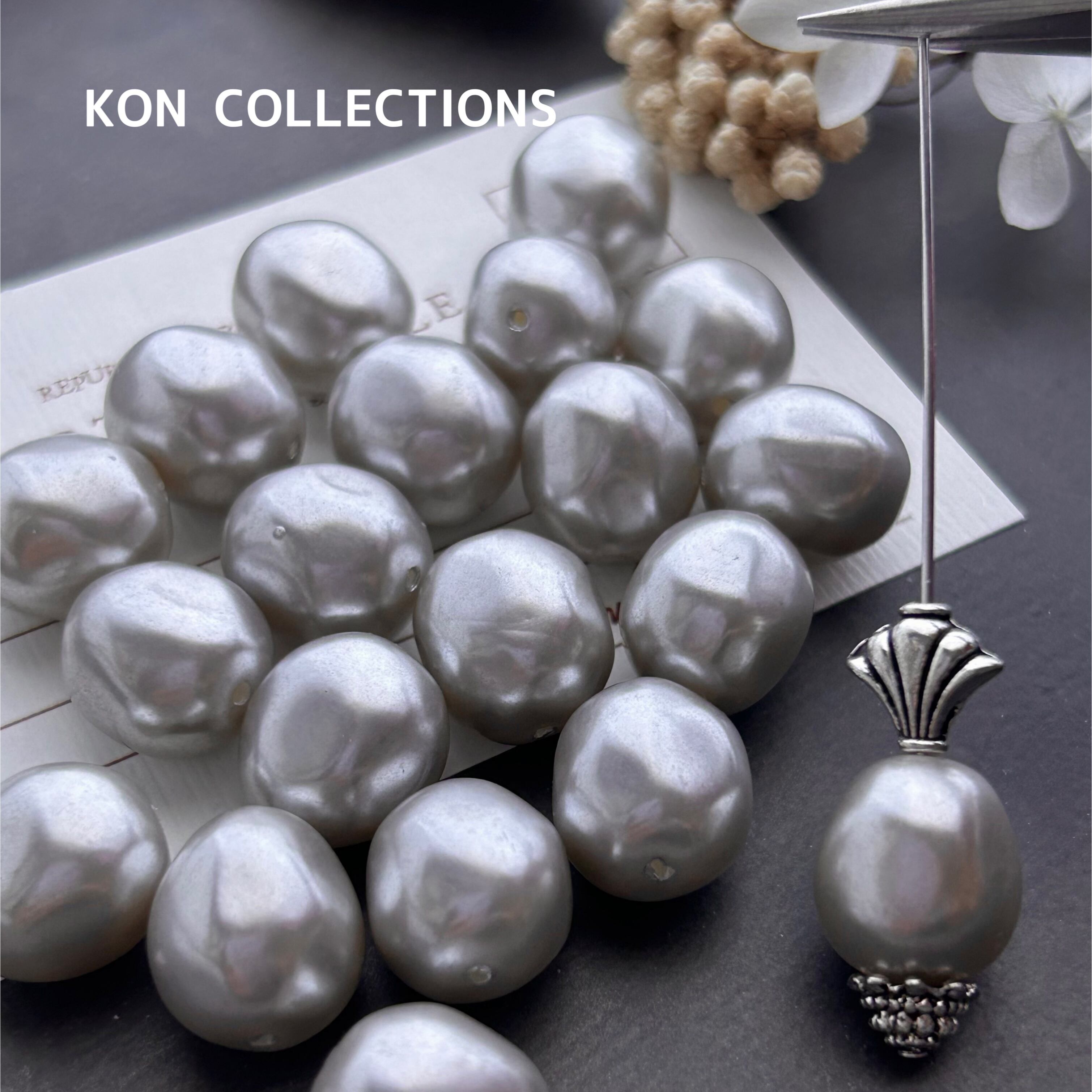 ヴィンテージビーズ2個/ライトグレー×パール×バロック