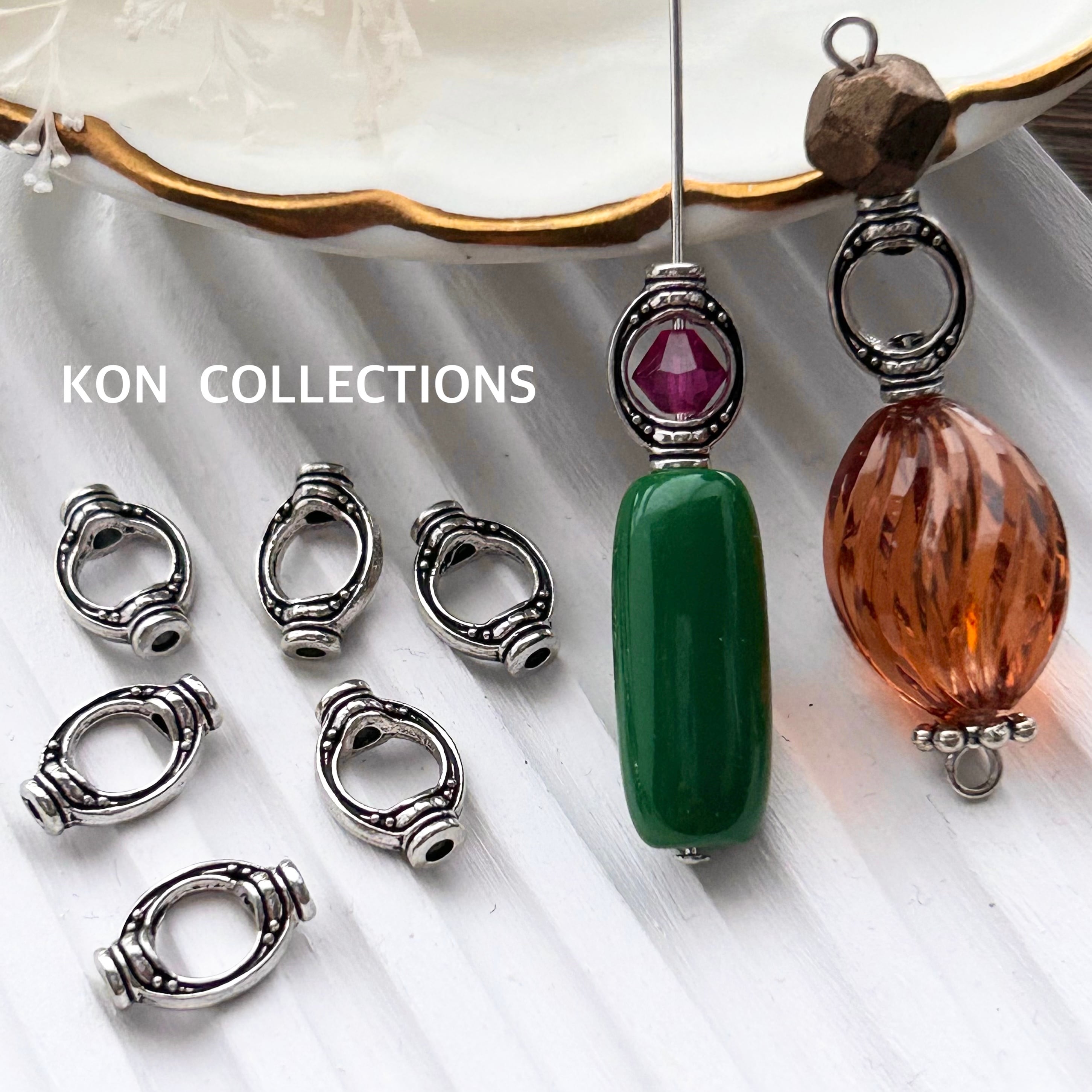 少し小さめのタイプ。ンテイークシルバーのため溝やライン部分など黒い色がついています。5mmサイズのビーズを間に通してもお使いいただけますが、上下にTピンを使ってコネクターのようにお使いいただくのもおすすめです♪ビーズを使用したものはサンプルのため付属しません。