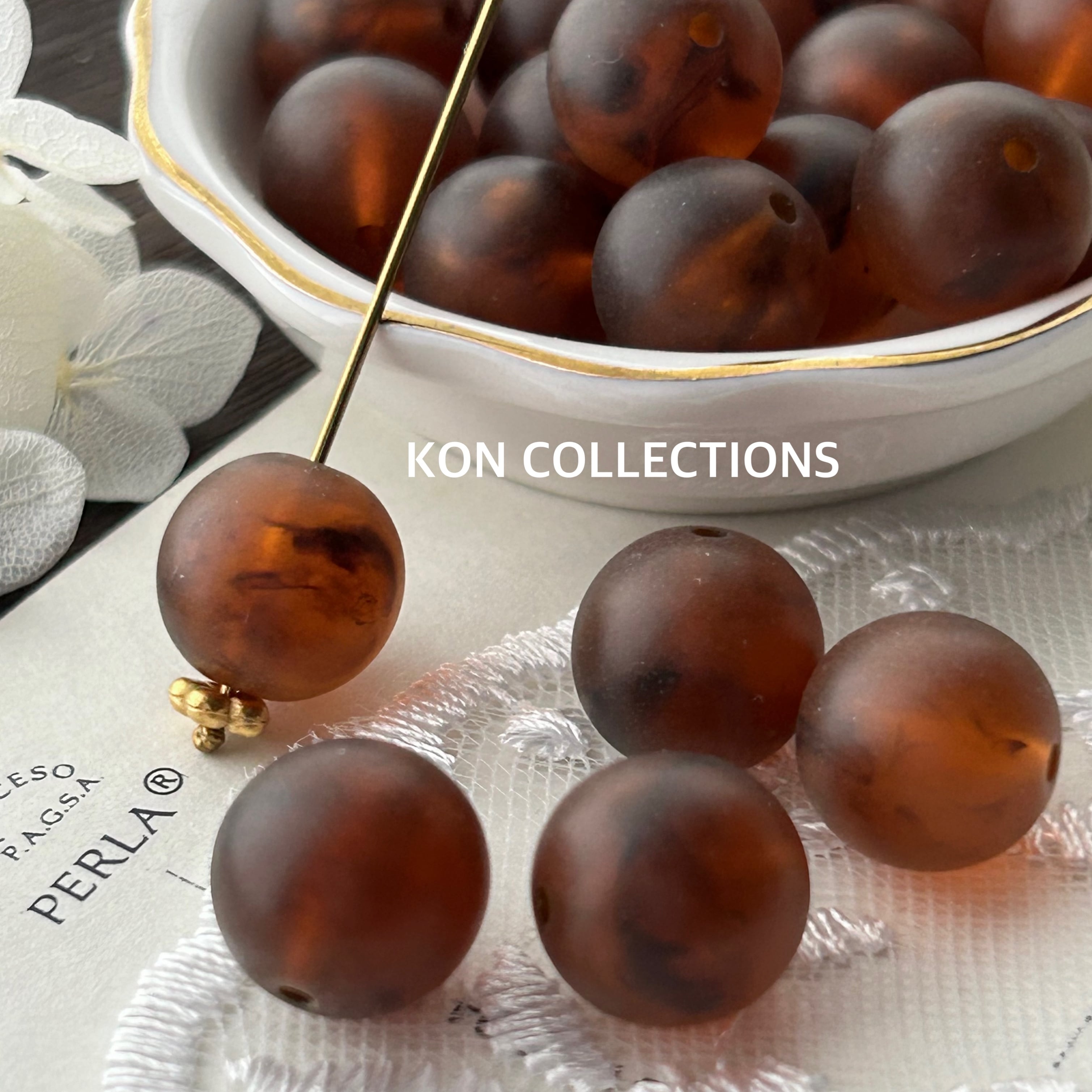 ヴィンテージビーズ4個/マットブラウンマーブル×ラウンド11mm