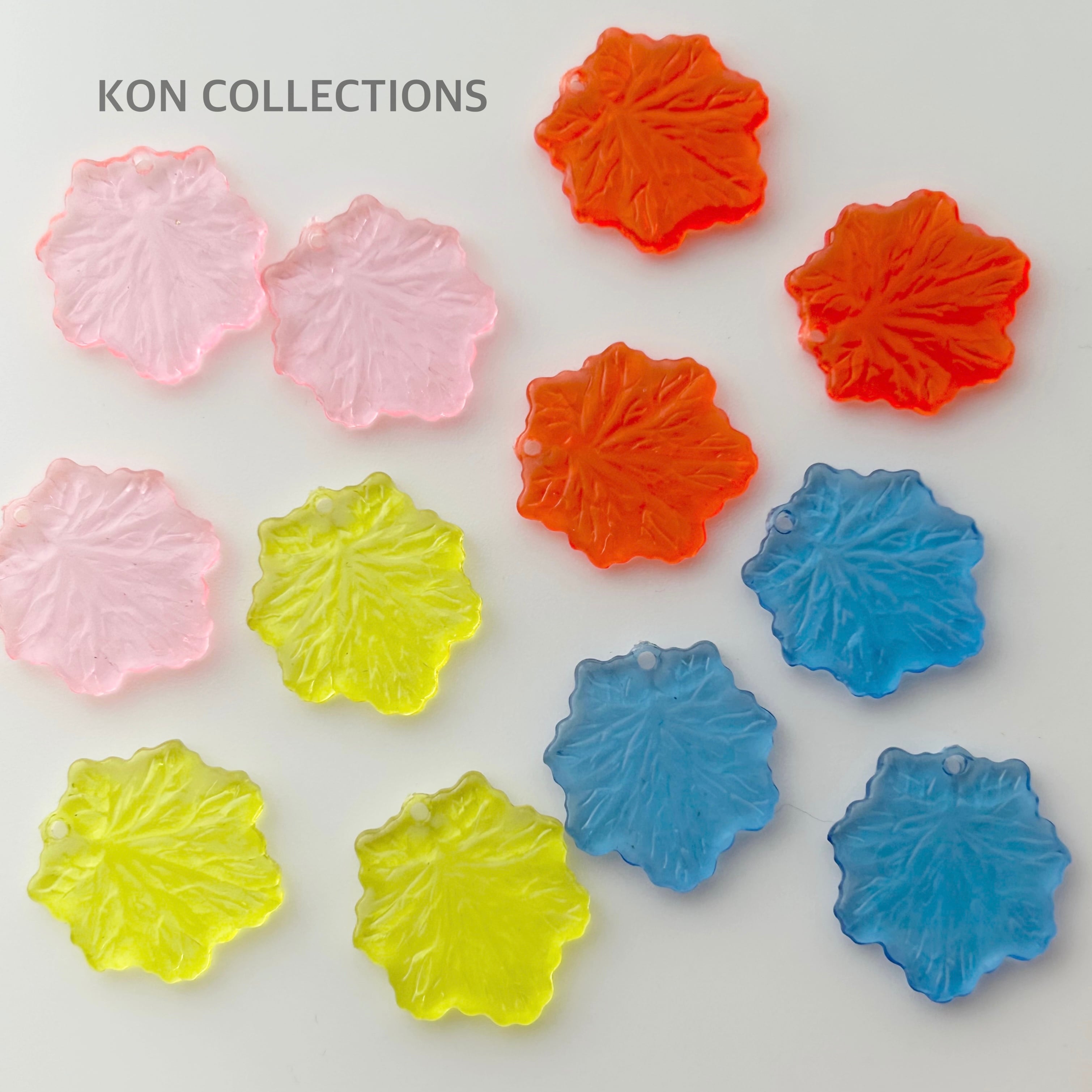 実物はオレンジはもう少し薄い色で透明感があります。ピンク色はよく見ると少し色合いに個体差があります。両面同じデザインで葉の筋も入っています。硬いタイプ。スタッカブルフラワーと組み合わせても♪ホール上部に型から外した跡が少しバリになっていますので、気になる場合はヤスリなどで整えてお使いください。