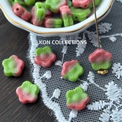 両面同じデザインの5弁のお花ビーズ。濃いめのピンク色とピスタチオグリーンの珍しいツートンカラーです。色の入り方は1個ずつ異なり、片面がほとんど1色の物も含まれます。