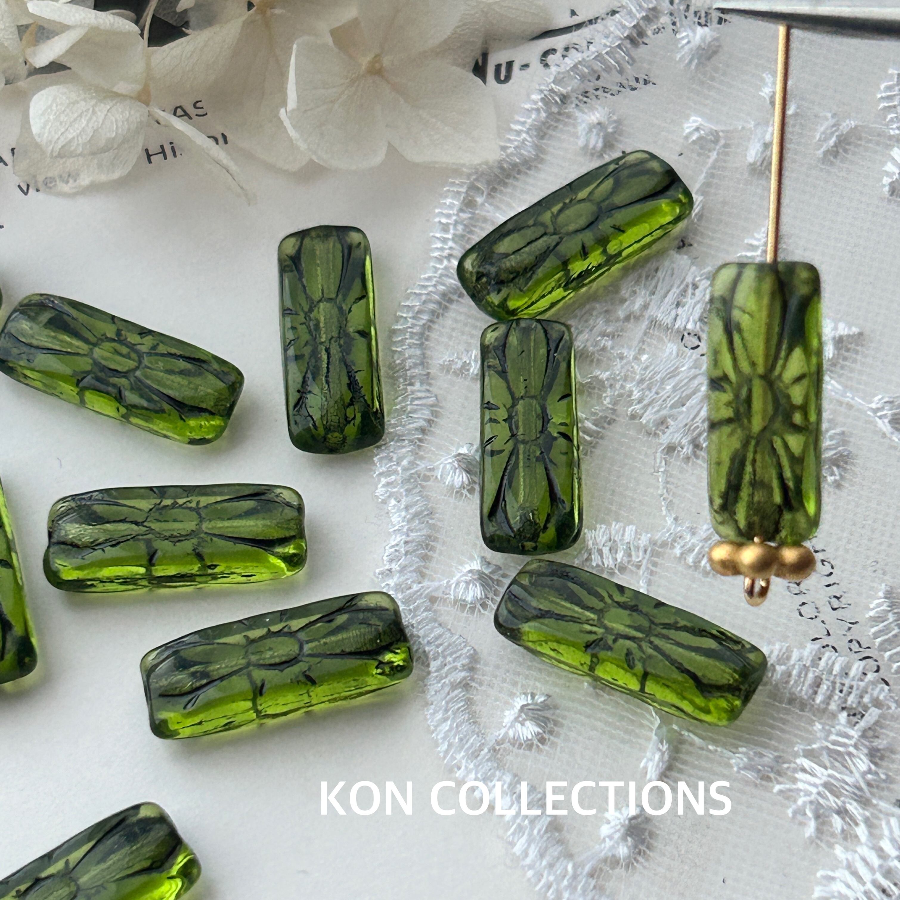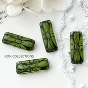 現代チェコガラスビーズ4個/お花模様×長方形×グリーンブラック