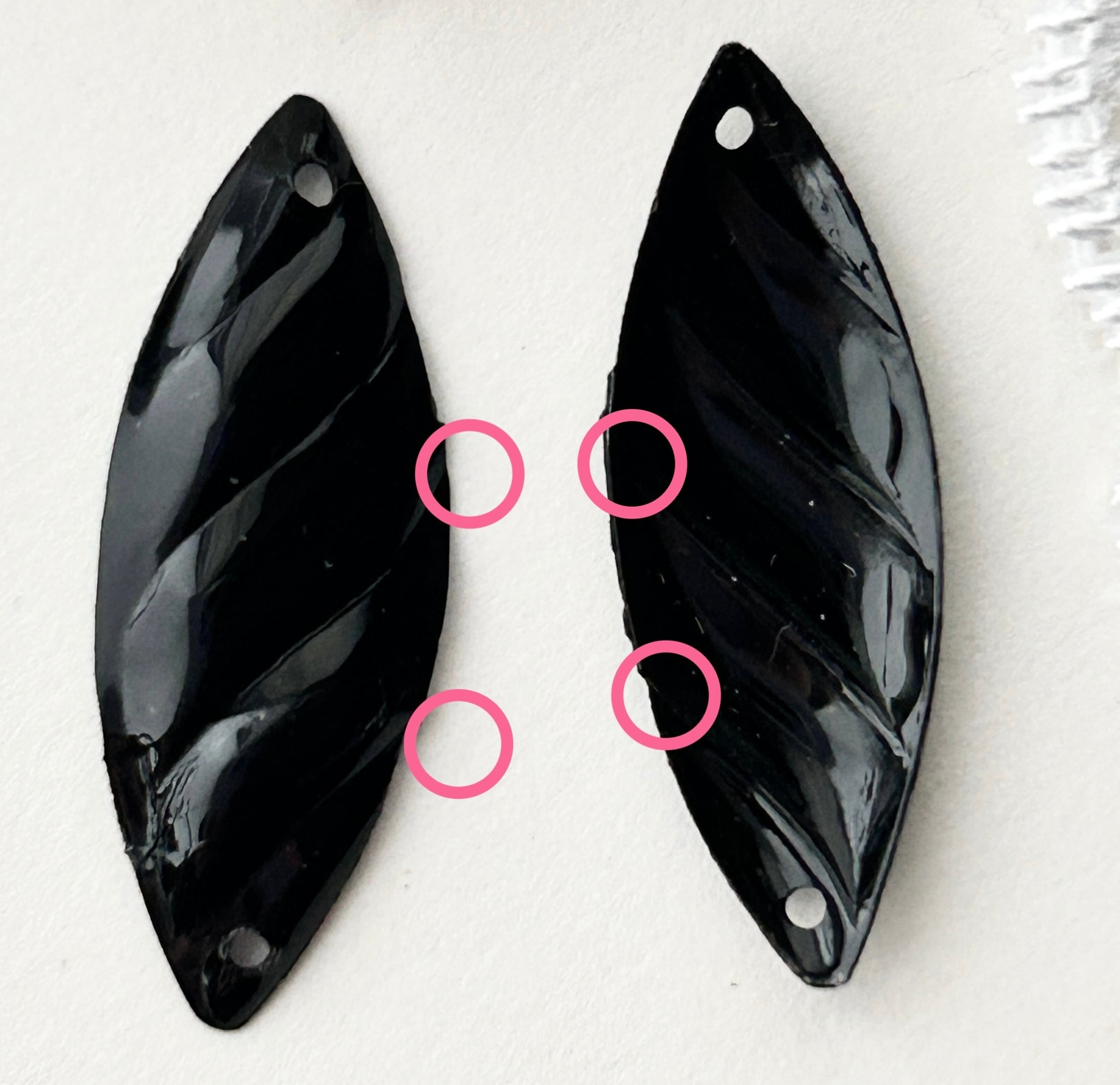 上下に小さな穴があいています。布などに縫い付けたり、軽い物でしたらコネクターのように使えるかもしれません。艶のあるブラック色。2枚目画像のように片側に箇所型から外した跡が出っ張っていますので、気になる場合はカットしてなめらかにしてお使いください。